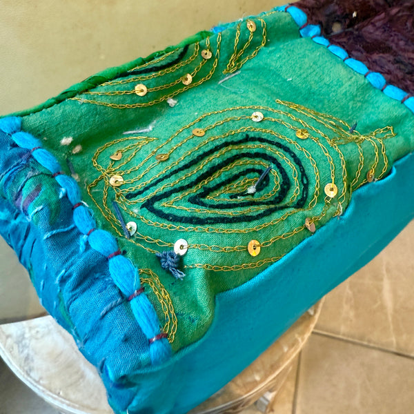 This ornate square cushion measures 41 x 41 cm (16" x 16") and 11 cm (4.25") high. The design features beautiful embroidery and mirrors. Perfect for a meditation space!