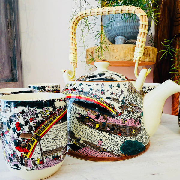 This tea set features the hustle and bustle on the river and on the shore. Porcelain pot with 6 cups for your own perfect tea gathering!